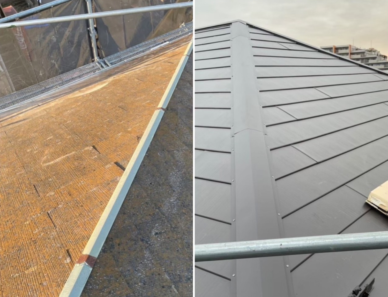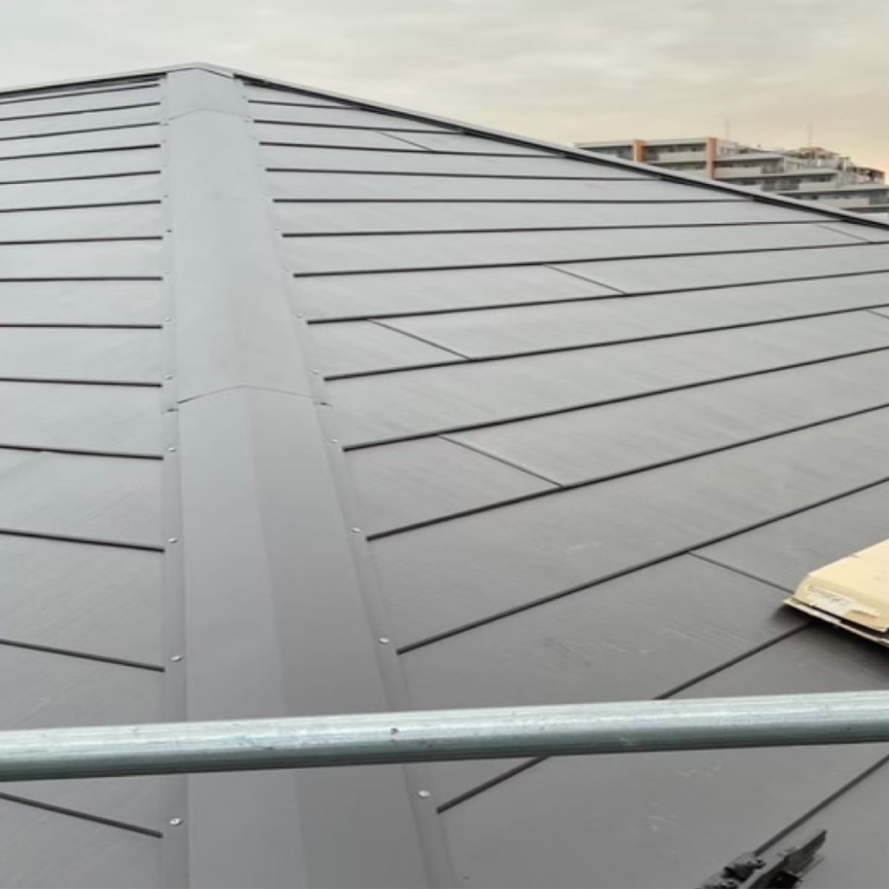 Y様邸の屋根を担当させていただきました。古くなったスレート屋根の上から軽量金属板(ガルバリウム鋼板)の屋根材を被せて、スレート屋根の完全葺き替えに比べて古いスレートの解体工事や廃材処理が不要です。このため、施工コストを抑えられ、短い工期でリフォームを完了できました。